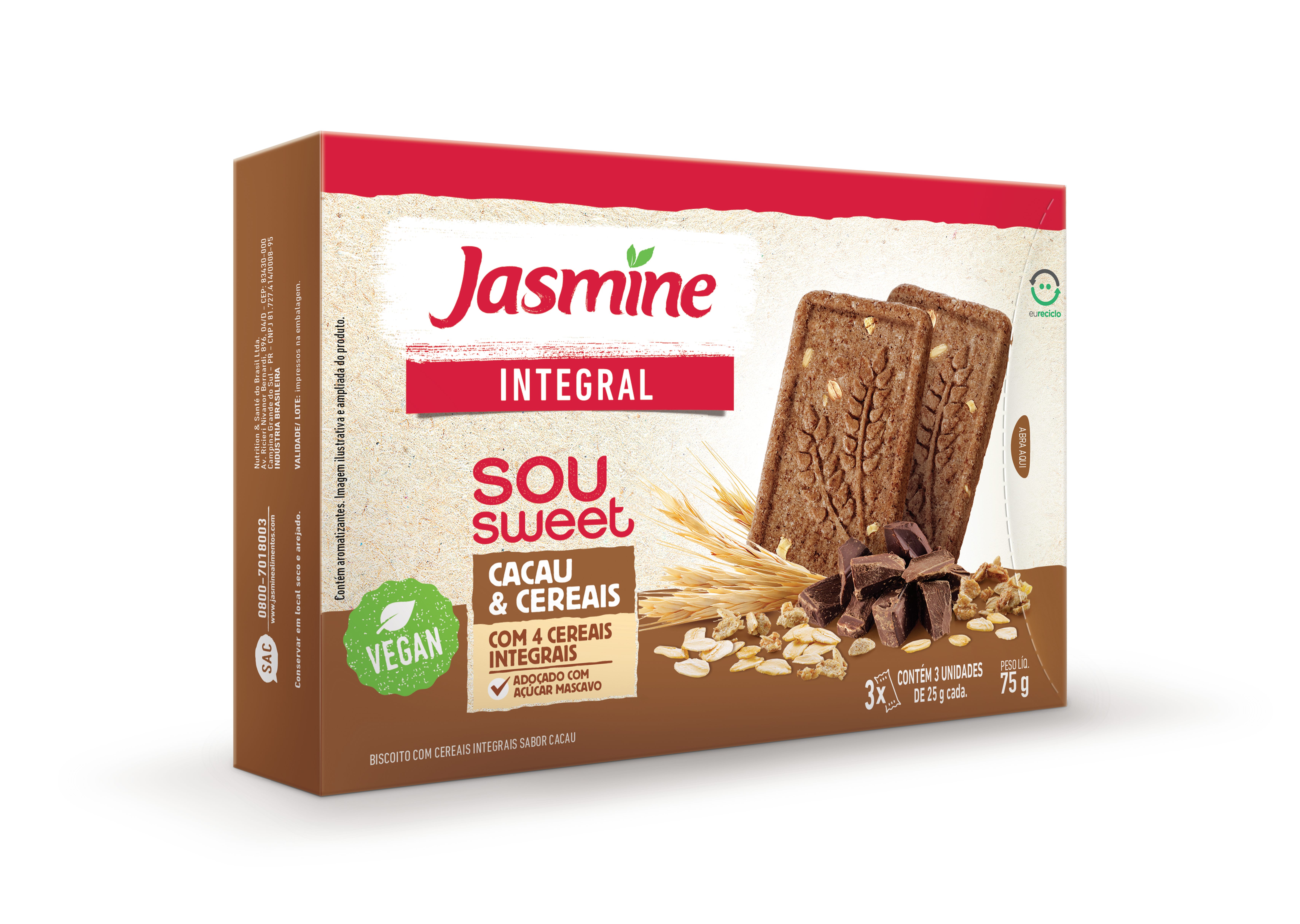 Cereais Integrais (trigo, aveia, arroz e milho), farinha de trigo integral, farinha de trigo enriquecida com ferro e ácido fólico, óleos vegetais (milho e ou girassol e ou algodão), açúcar mascavo, fibra natural solúvel, cacau em pó, amido, sal, aromas, emulsificante natural lecitina de soja e fermentos fosfato monocálcico, bicarbonato de sódio e bicarbonato de amônio.